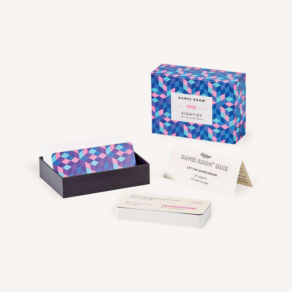 Pull up your leg warmers and fire up the DeLorean because we're heading to the 80s with this 80s Pop Culture Trivia from Games Room! Who will be on the A-Team and who'll be on Team Betamax? From questions about Super Mario and Street Fighter to Madonna and Ghostbusters, put your knowledge of the decade to the test! Packaged in a geometric print box, the set contains 140 question cards and instructions.