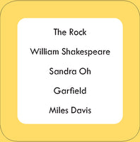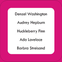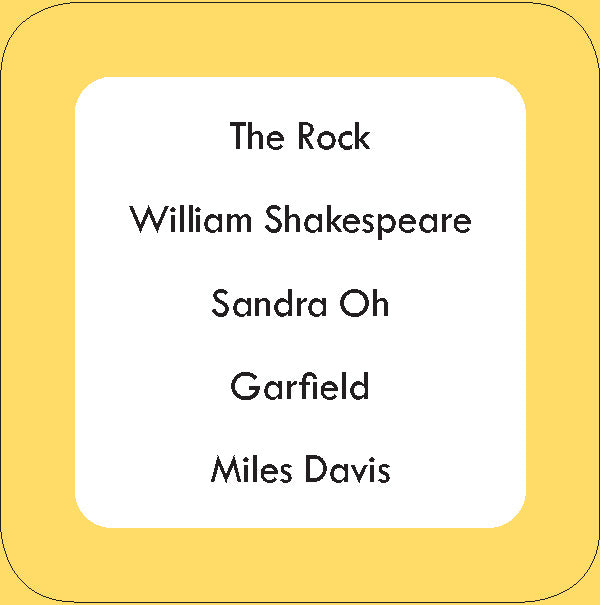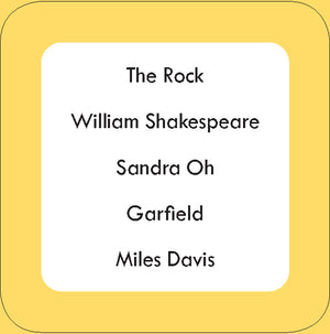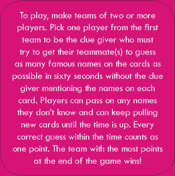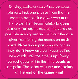 Split the players into teams of two. One player draws a card and holds it to their forehead without reading it. Their teammate picks one of the five names on the card and tries to help their partner guess it as quickly as possible within one minute. If they get the right name fast, they can continue with the other two names on the card or take a new card and continue to play. After one minute, play switches to the next team. The team with the most correct answers wins!
