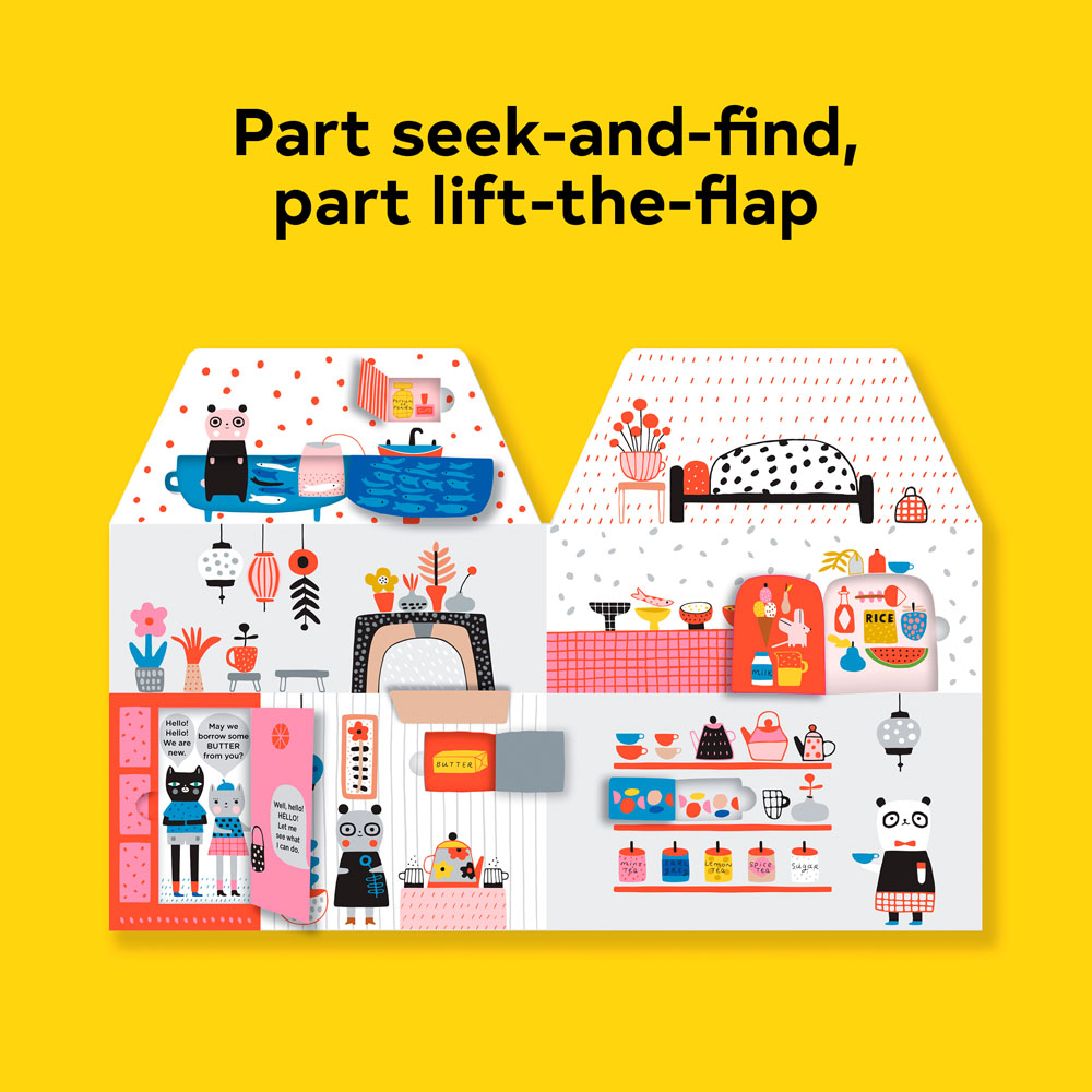 - SEEK-AND-FIND meets LIFT-THE-FLAP: More than 60 flaps to lift and explore! Each spread features a new neighbor's home—get to know each family's interests, hobbies, collections, and favorite colors in these immersive and detailed scenes. Then, lift the flaps on each spread to find the next ingredient needed to bake cookies!