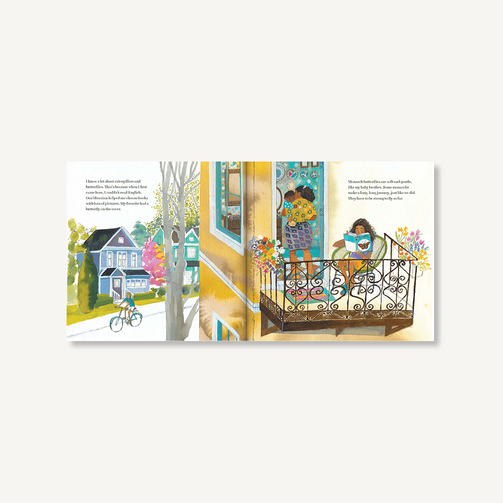 "[In Butterflies Belong Here] creative illustrations parallel the shifts in tone, with scientific information presented as if on the pages of a textbook, in contrast to glowing illustrations of an idyllic neighborhood filled with people, colorful buildings, and a community garden. . . . Readers inspired by the [main character’s] activism can find additional resources on monarchs and environmental activism in the book’s closing pages."