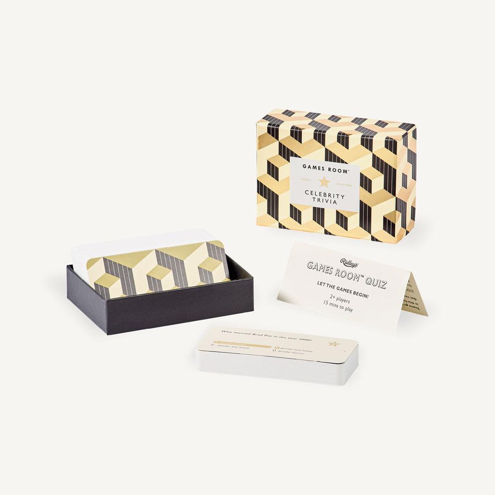 Step onto the red carpet and thrust your friends and family into the limelight with this Celebrity Trivia from Games Room! Who will become Hollywood Royalty and who'll become a box office flop? From questions about The Weeknd's real name to which Spice Girl married first, see who comes out on top as the ultimate celeb fanatic! Packaged in a geometric print box, the set contains 140 question cards and instructions.