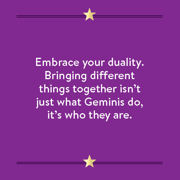 - Embrace your duality. Bringing different things together isn’t just what Geminis do, it’s who they are.