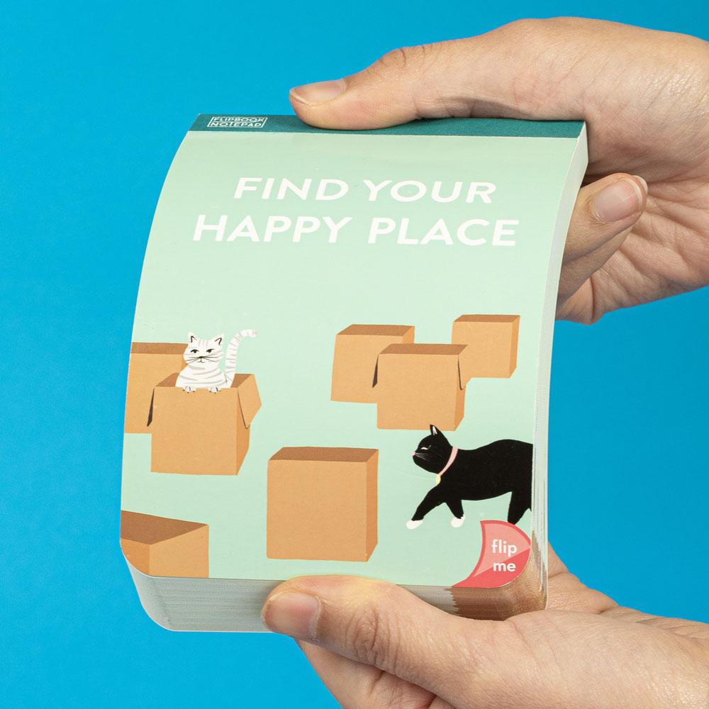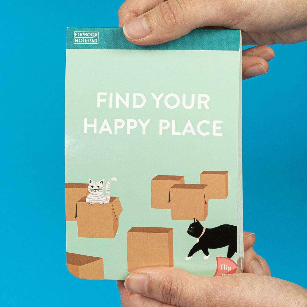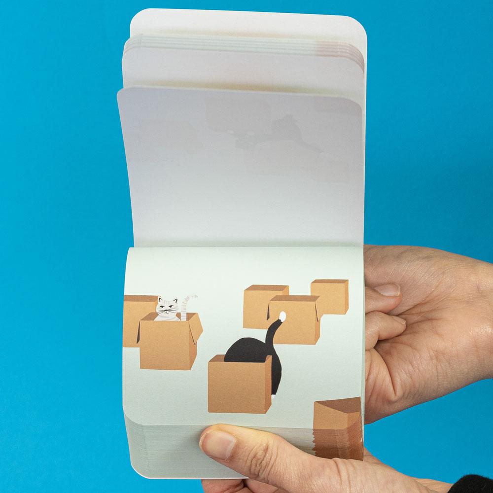 This stationery is anything but stationary! Animate your ideas with these illustrated notepads that also function as flipbooks, ready to fill slow moments with flipping delight! Playful cats run through the pages of this illustrated notepad that also doubles as a flipbook, with plenty of space to write while a scene animates at the bottom. Jot down notes, to-dos, or travel ideas, or flip the pages to watch cats hop in and out of boxes in search of the perfect one, in an on-the-go size for anyone looking for their own happy place.