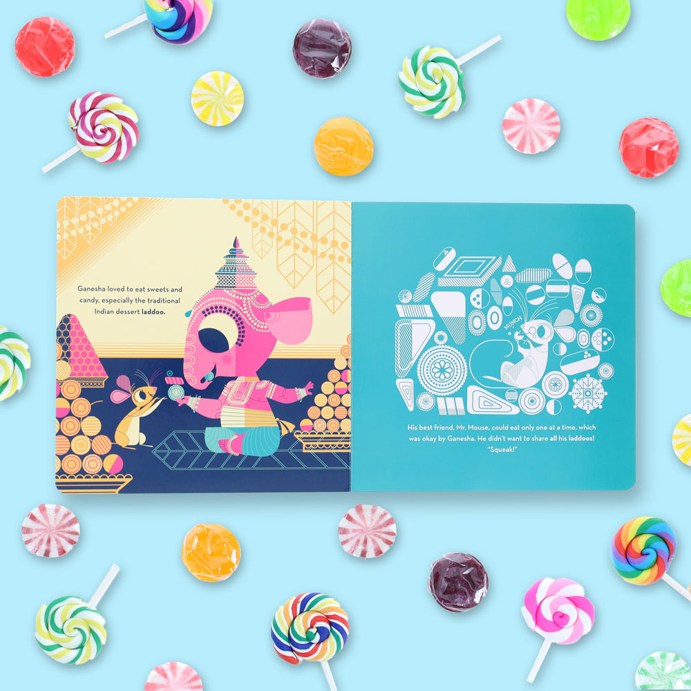 Now in board book, the bold, bright colors of India leap off the page in this fresh and funny picture book retelling of how Ganesha came to write the epic poem of Hindu literature, the Mahabharata.