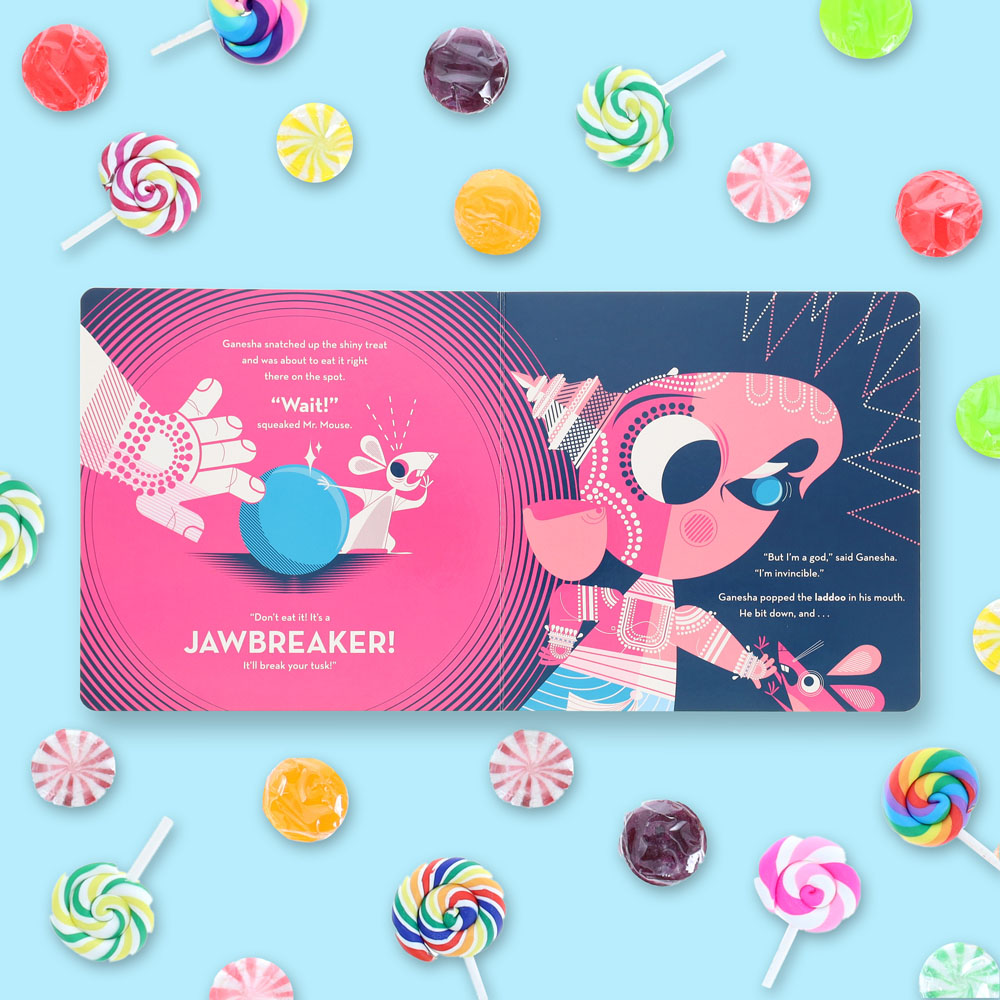 Ganesha is just like any other kid, except he has the head of an elephant and rides around on a magical mouse. And he loves sweets, especially the traditional dessert laddoo. But when Ganesha insists on biting into a super jumbo jawbreaker laddoo, his tusk breaks off! Ganesha is terribly upset, but with the help of the wise poet Vyasa, he learns that what seems broken can actually be quite useful after all. With vibrant, graphic illustrations, expressive characters, and off-beat humor, this is a wonderfully inventive twist on a classic tale.