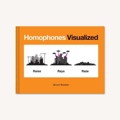 Do ewe no what homophones are? They're words that sound alike but are spelled differently and have completely different meanings—it's knot always easy to get it right. Based on his blog Homophones, Weakly, Bruce Worden's Homophones Visualized uses simple but clever graphics to help illustrate the differences between 100 pairs (or triplets or quadruplets) of words that sound alike. From beat and beet to flee and flea, baron and barren to golf and gulf, each spread contains a pair or group of homophones and corresponding illustrations that provide context for each word. Word lovers, educators, and kids all will delight in this witty and useful homophone guide to understanding which word is witch.