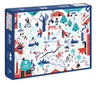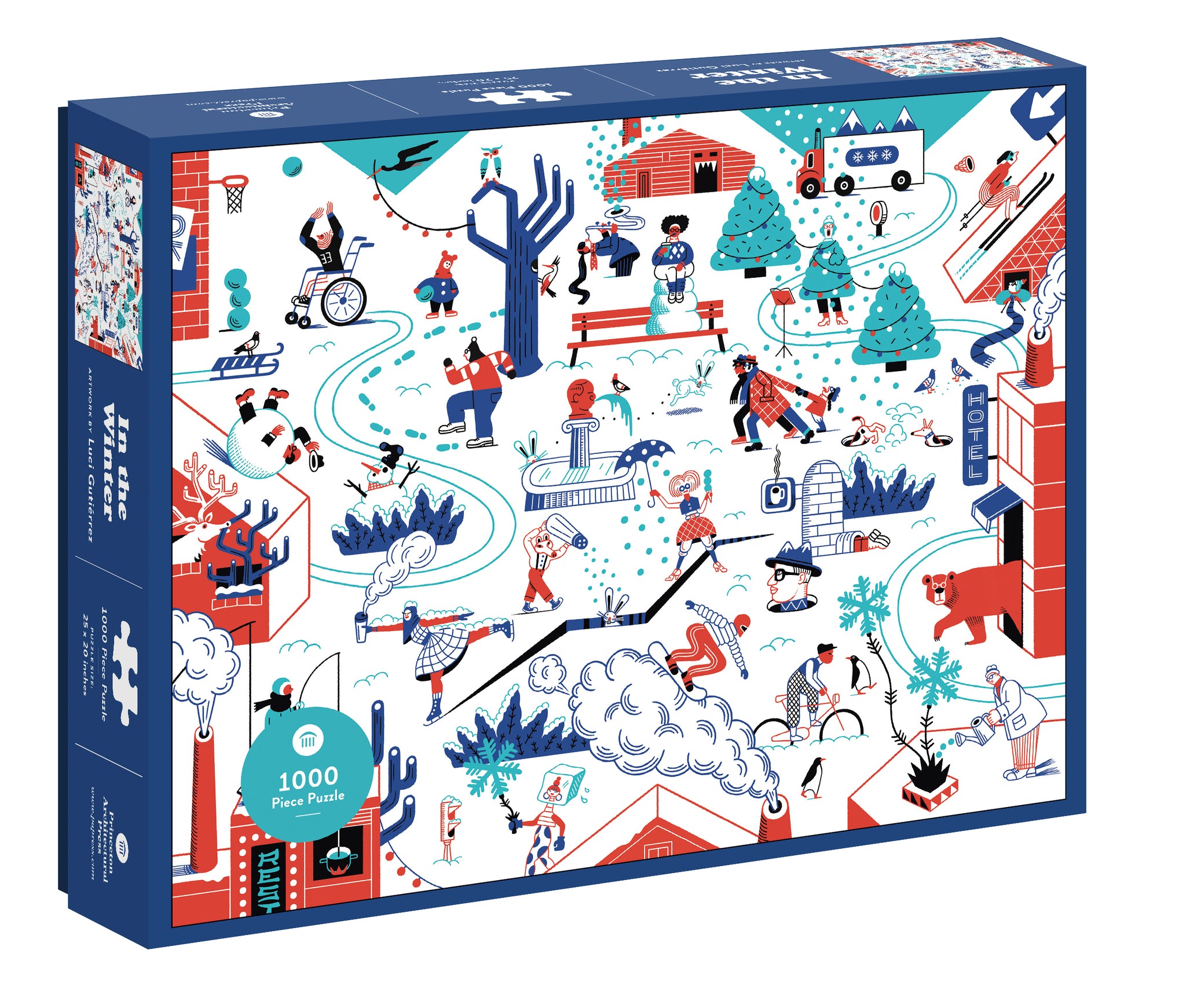 This richly layered puzzle contains almost every classic reason to love the wintertime, but each with an unexpected twist: a man rolls around in a snowball, Christmas trees sing, a skier goes up instead of down, a fox pours salt on the road. Spanish illustrator Luci Gutierrez brings her love of funny characters and fascinating details to the classic winter scene. A whimsical cataloging of the joy found in outdoors in the winter, and a true celebration of the winter season, this puzzle is sure to provide hours of puzzling fun for the whole family.