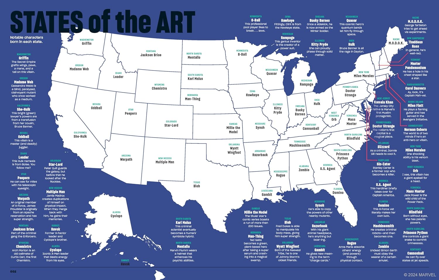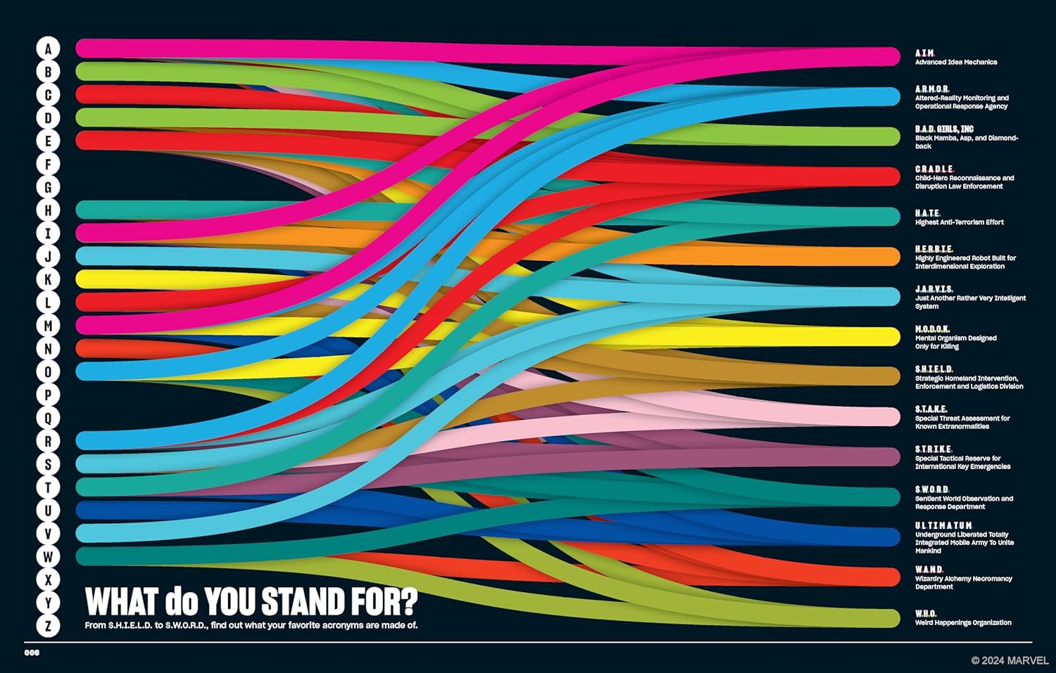 “Tim Leong’s sly, charming infographics dive deep into the glorious weirdness of the Marvel Universe and resurface with elegant and frequently hilarious visualizations of decades-long epics and astonishing minutiae.”