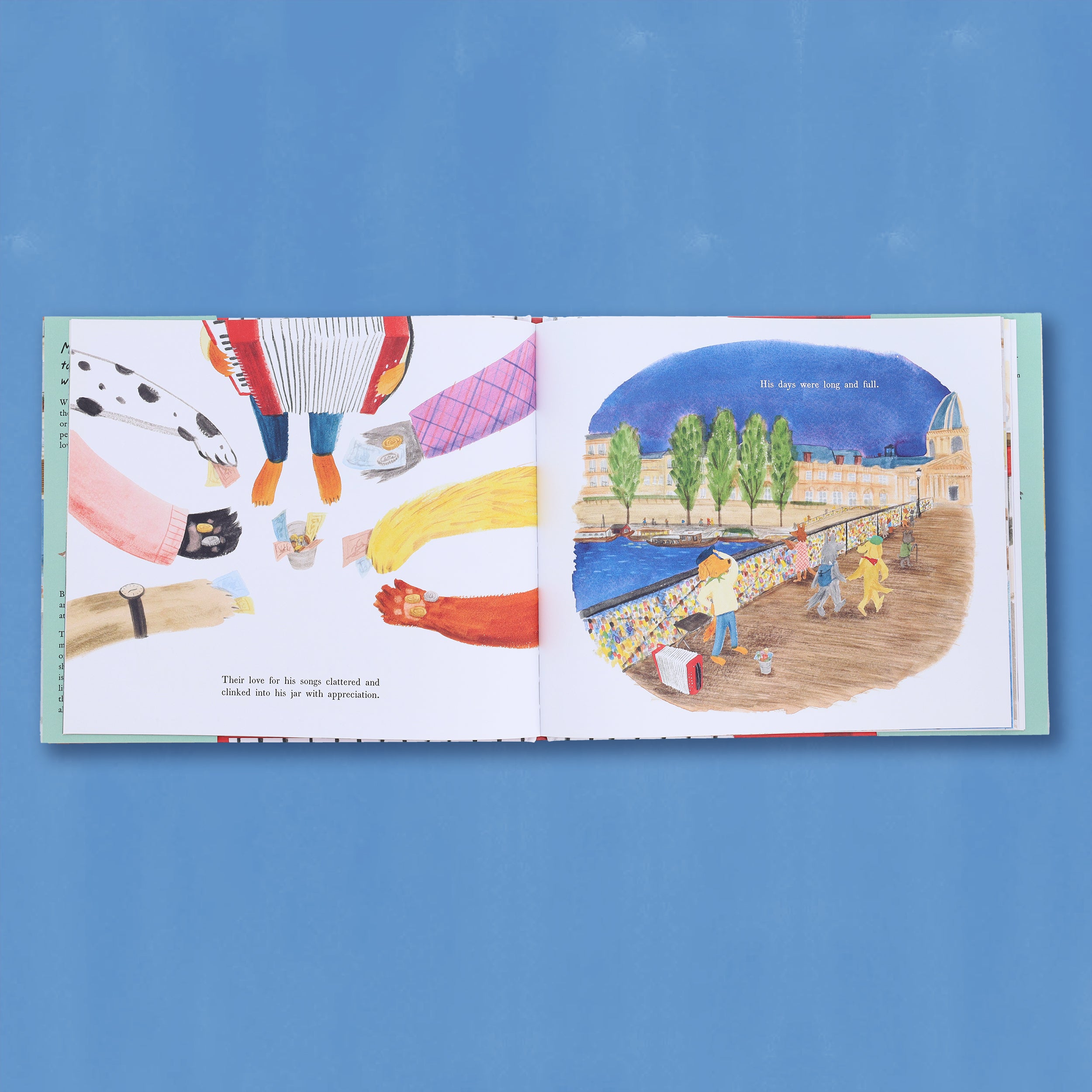 GORGEOUS WATERCOLOR ARTWORK: Each page of this charming book set in Paris is awash with color and details to delight the eyes and the heart. Although he's a dog that plays the accordion, Maurice is a character almost everyone can recognize in the real world, and each scene reminds us how music like Maurice's scores city streets, parks, plazas, and markets. Readers young, old, and in between will love this fresh, deeply felt story about those members of society we may forget to appreciate despite their impact on us all.
