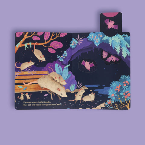 When you rest your head at night, nocturnal animals awake to dance and play! Push and pull the sturdy tabs to make foxes frolic and hedgehogs hustle in this sweet, interactive tale of nighttime fun.