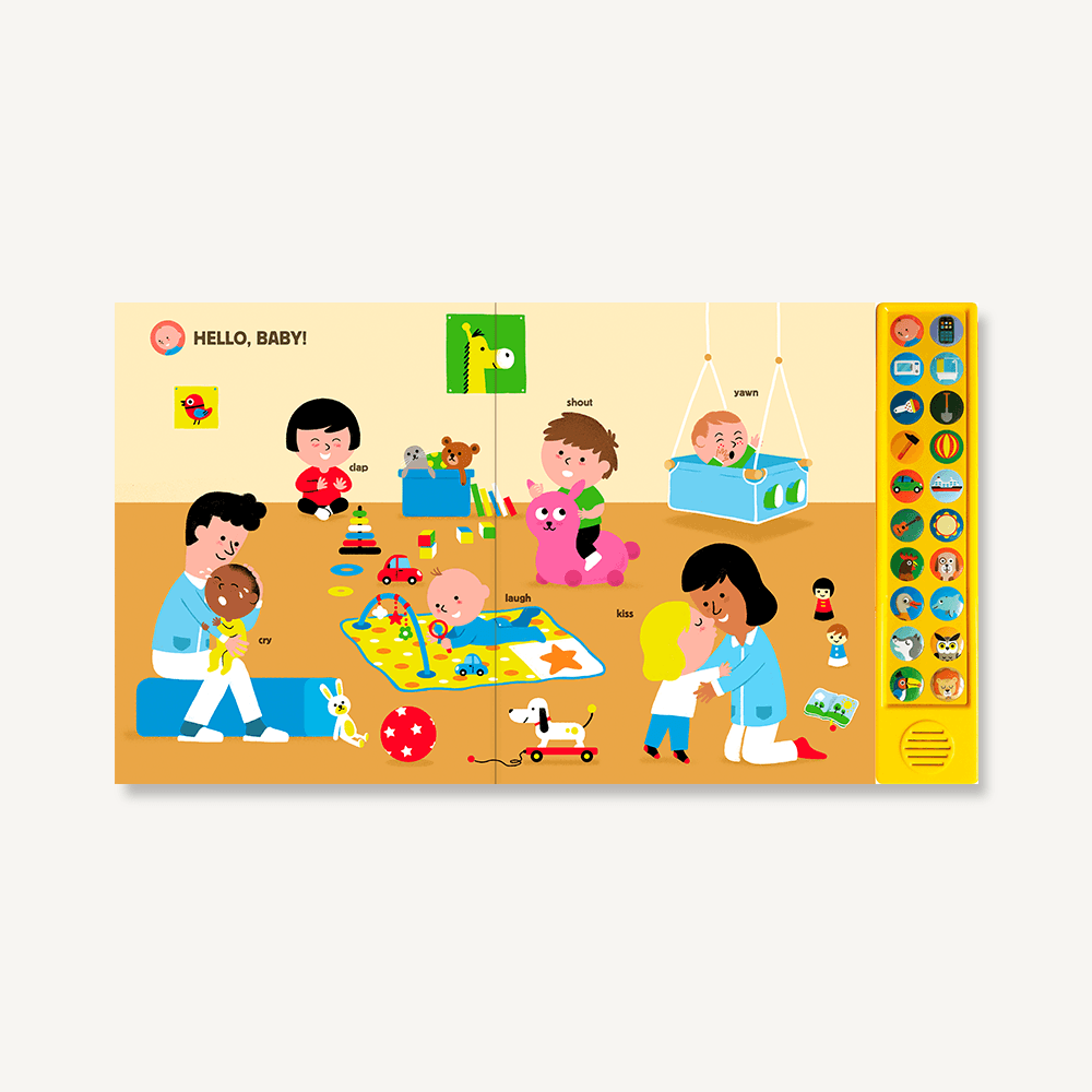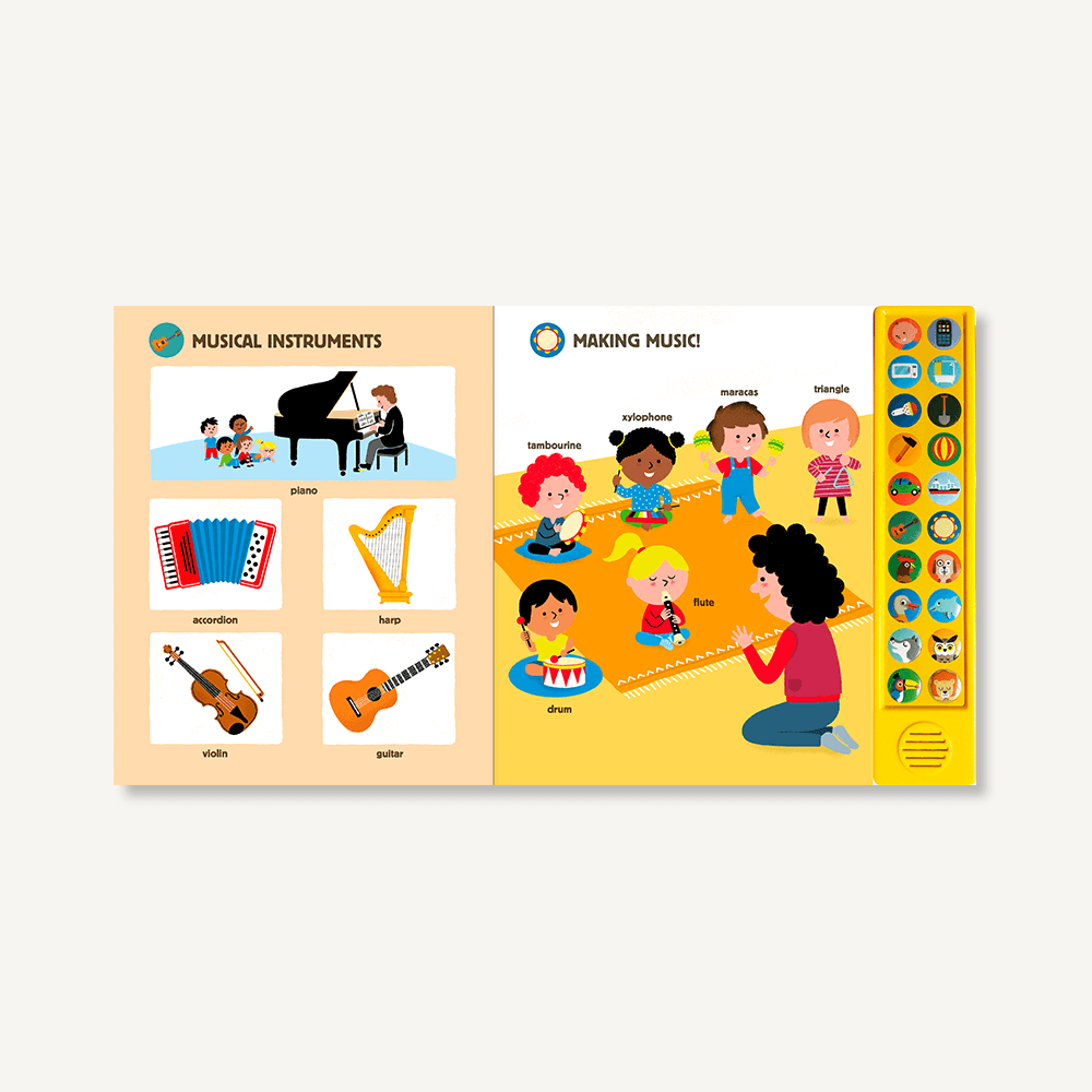 Ding dong! Flush! Moo! Roar! What’s that sound? Press the buttons to find out! Listening is an important part of language development, and this sound book will engage very young children as they explore sounds and words found in familiar settings, and perhaps some not-so-familiar ones. The 20-button sound panel includes 100 sounds and words; each button accompanies a spread where the actions, objects, and animals are named, followed by the appropriate sounds. From sounds in the home and on the street to sounds in the jungle and even in the ocean, little ones will learn to identify sounds and name the animals and objects that make them.
