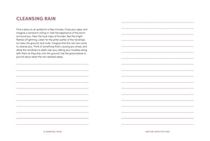 From the author of the popular Nature Meditations Deck, this guided journal makes it easy to tap into the restorative power of nature. Within these pages are simple mindfulness practices, reflection prompts, and guided activities organized into four sections:
