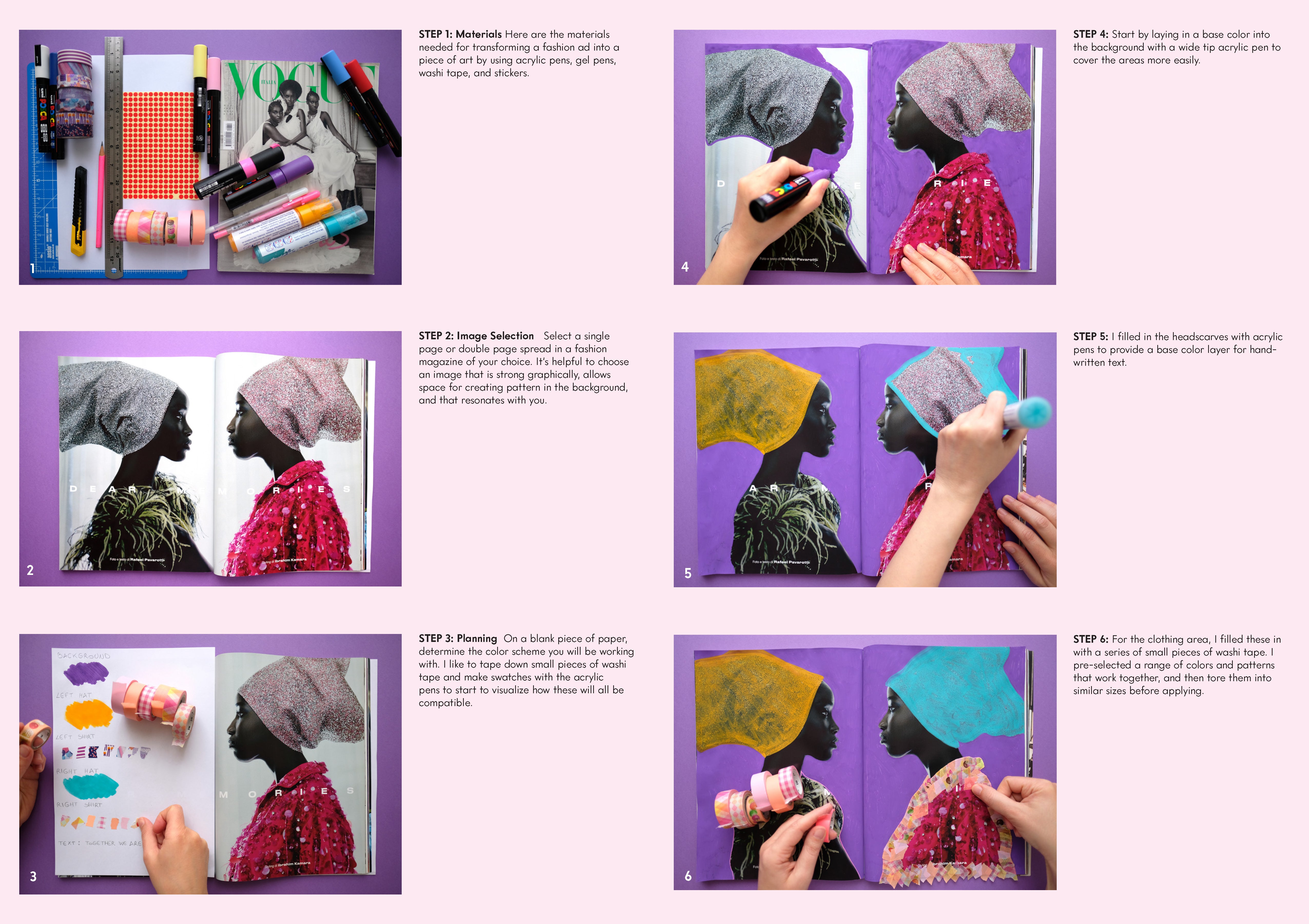 - Materials, techniques, and tools, from what types of acrylic paint pens she uses to the specific Washi tape she favors to how to explore pattern and color palettes through layering and hand-lettering.
