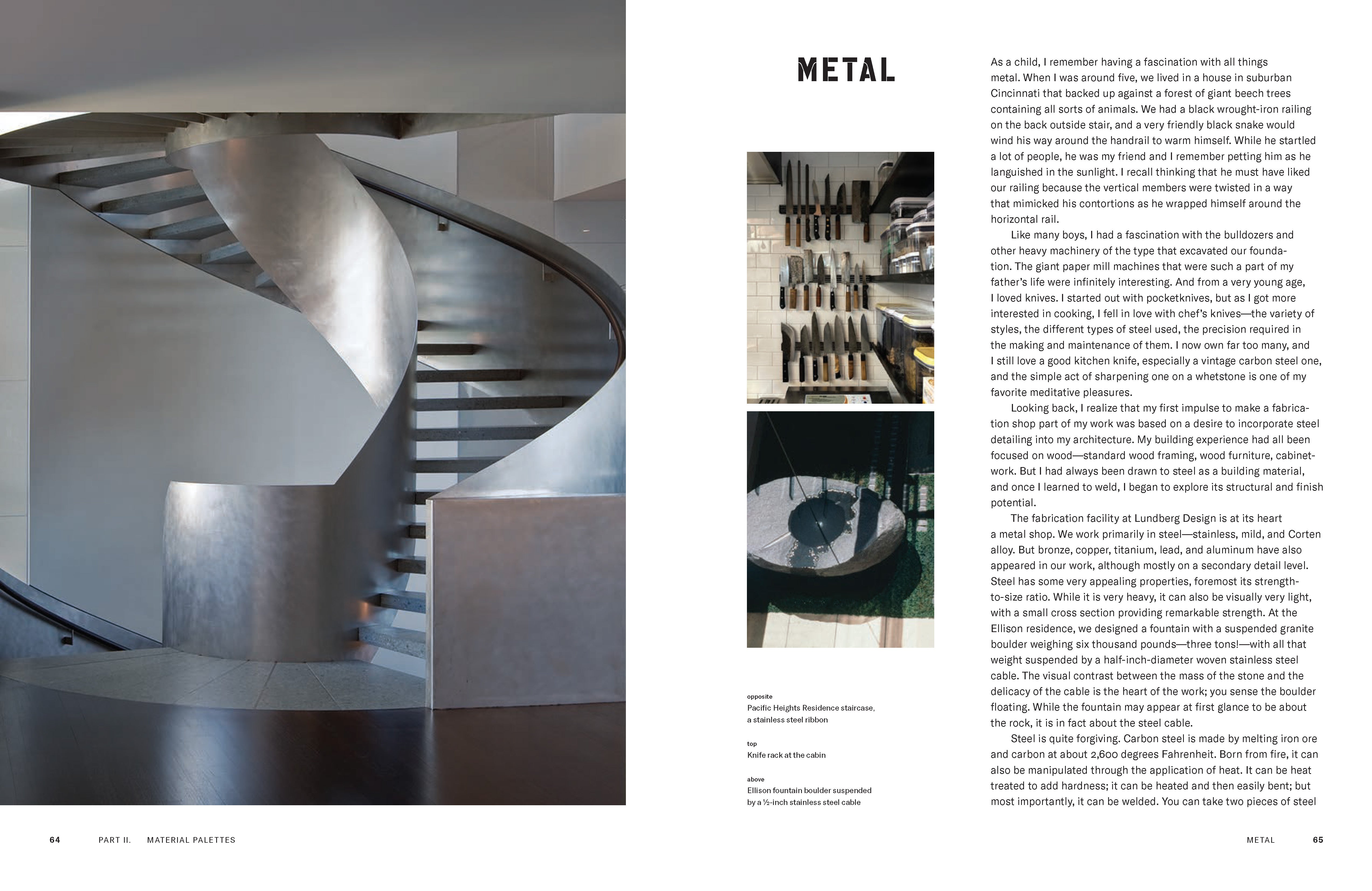 Explore these lush, photo-rich pages to read Lundberg’s personal narrative, take a deep dive into his preferred material palettes—metal, stone, glass, wood, and objects—and learn about the planning and execution of five outstanding projects: