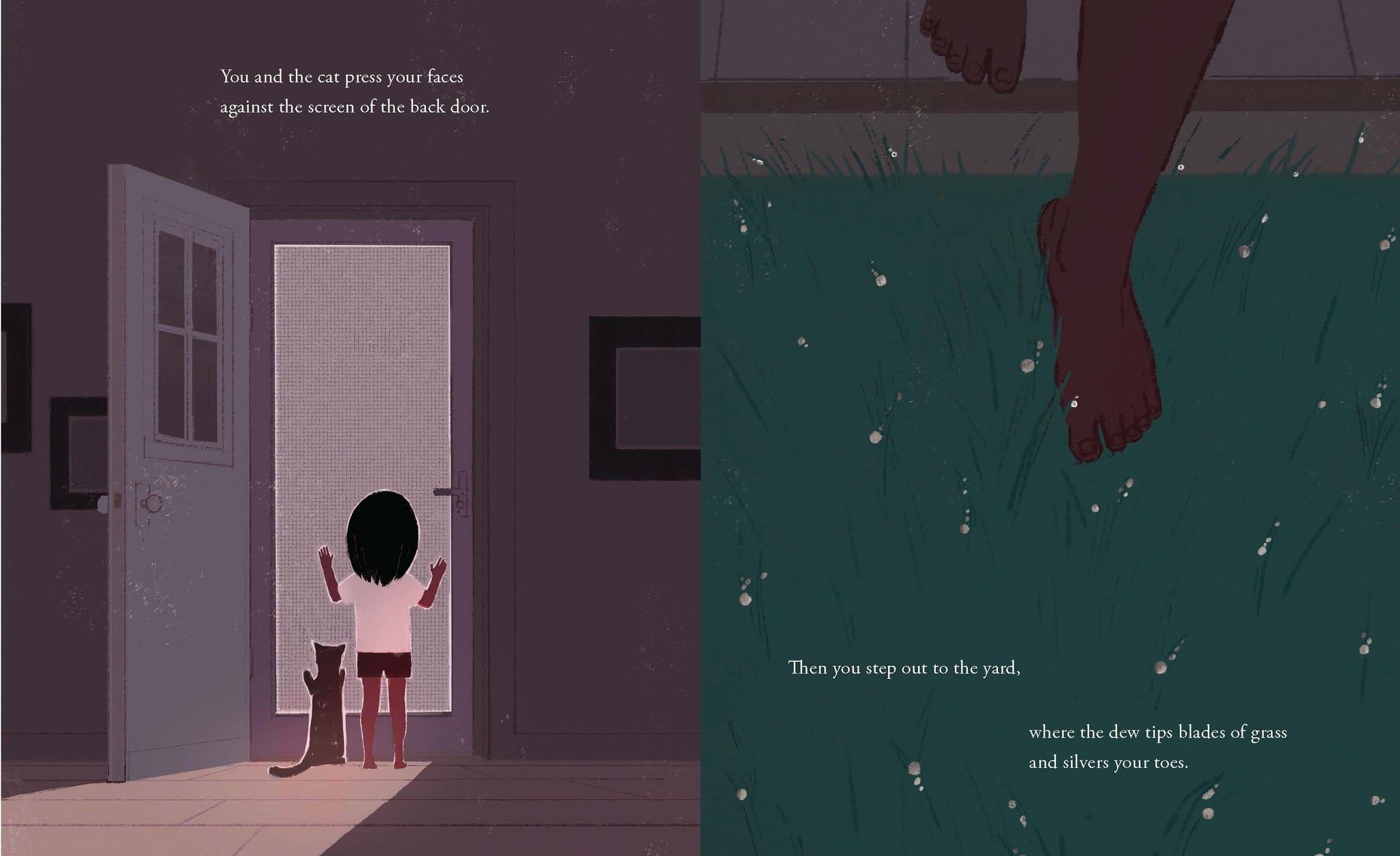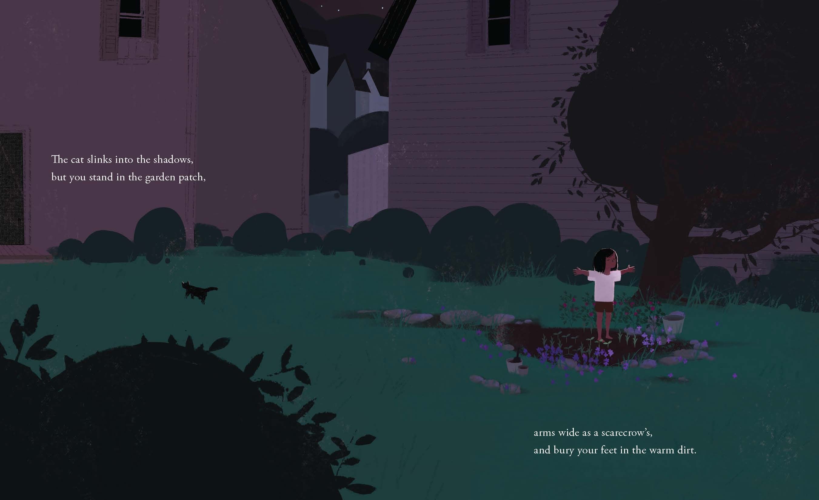 On a summer night, the world is still. Even the crickets think it’s too hot to sing. But all at once, a girl wakes. In the kitchen, the cat rolls onto its soft paws. A neighbor’s small white dog yaps, a brown rabbit peeks from a hedge, and the leaves of a cherry tree begin to stir in the breeze. Readers witness and wonder: