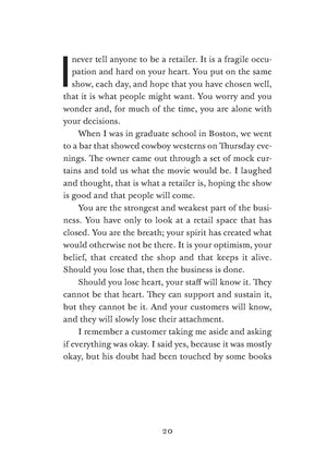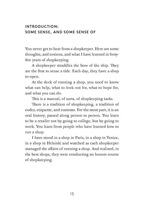 “There is a tradition of shopkeeping, a tradition of codes, etiquette, and customs. For the most part, it is an oral history, passed along, person to person. You learn to be a retailer—not by going to college, but by going to work. You learn from people who have learned how to run a shop.” [from the Introduction]