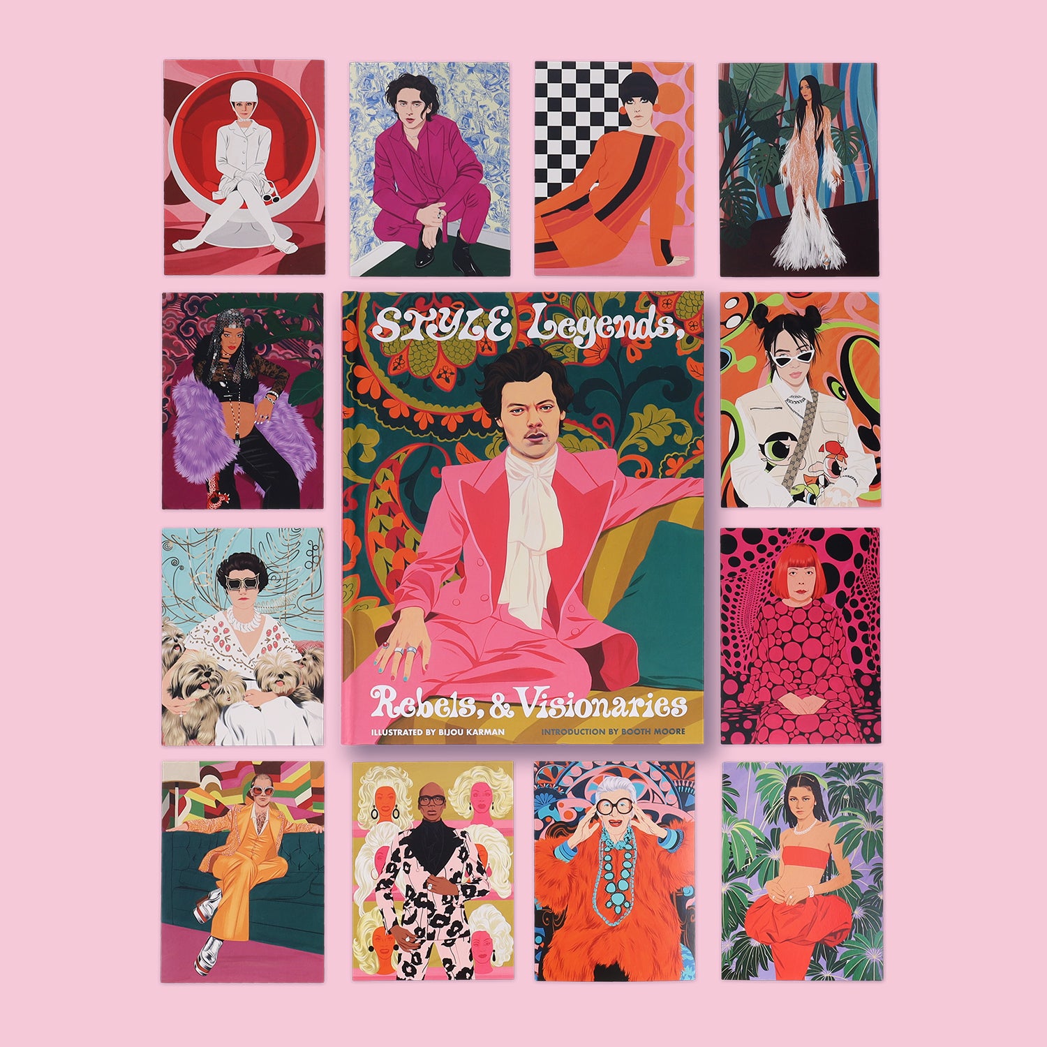 CURATED LIST OF ICONS: This eclectic and inclusive collection is a curated take on iconoclasts known for their distinctive style. Bijou Karman's colorful and visually stunning illustrations and distinct aesthetic bring a fresh perspective to viewing these celebrated individuals and their contributions to modern fashion.