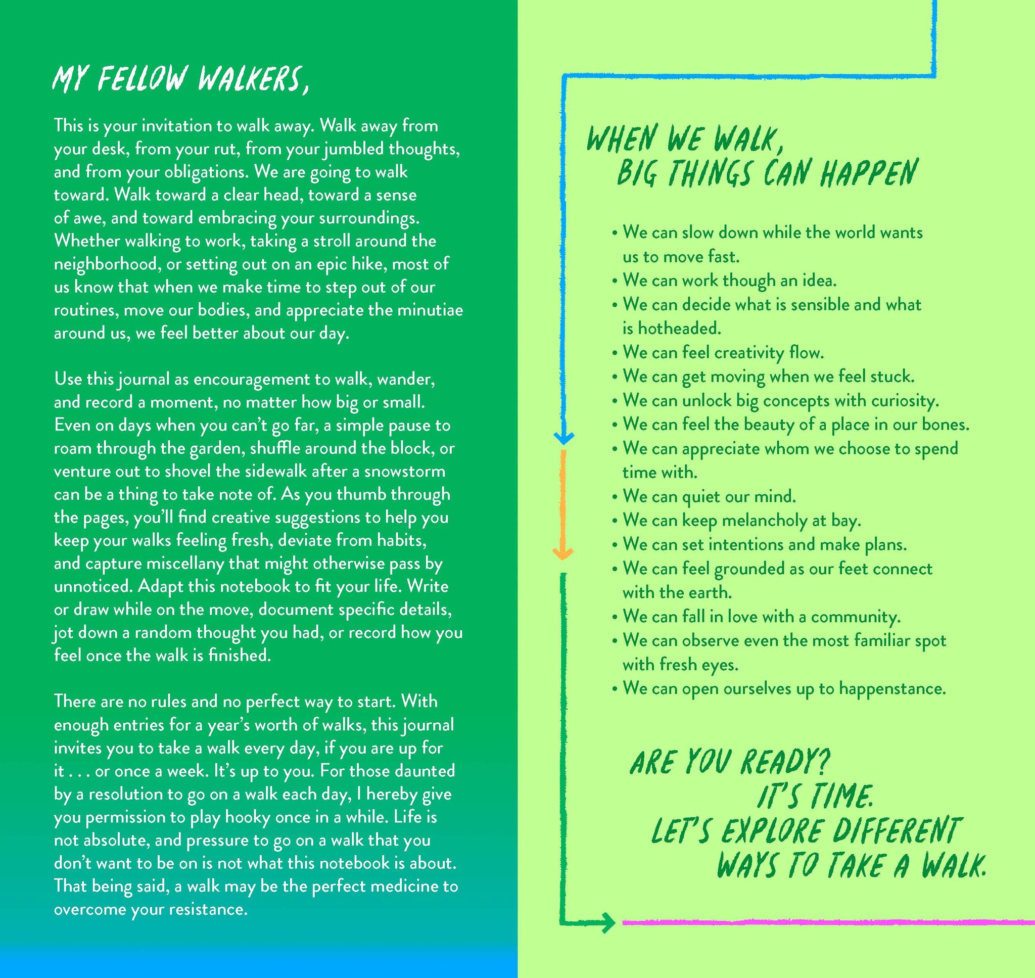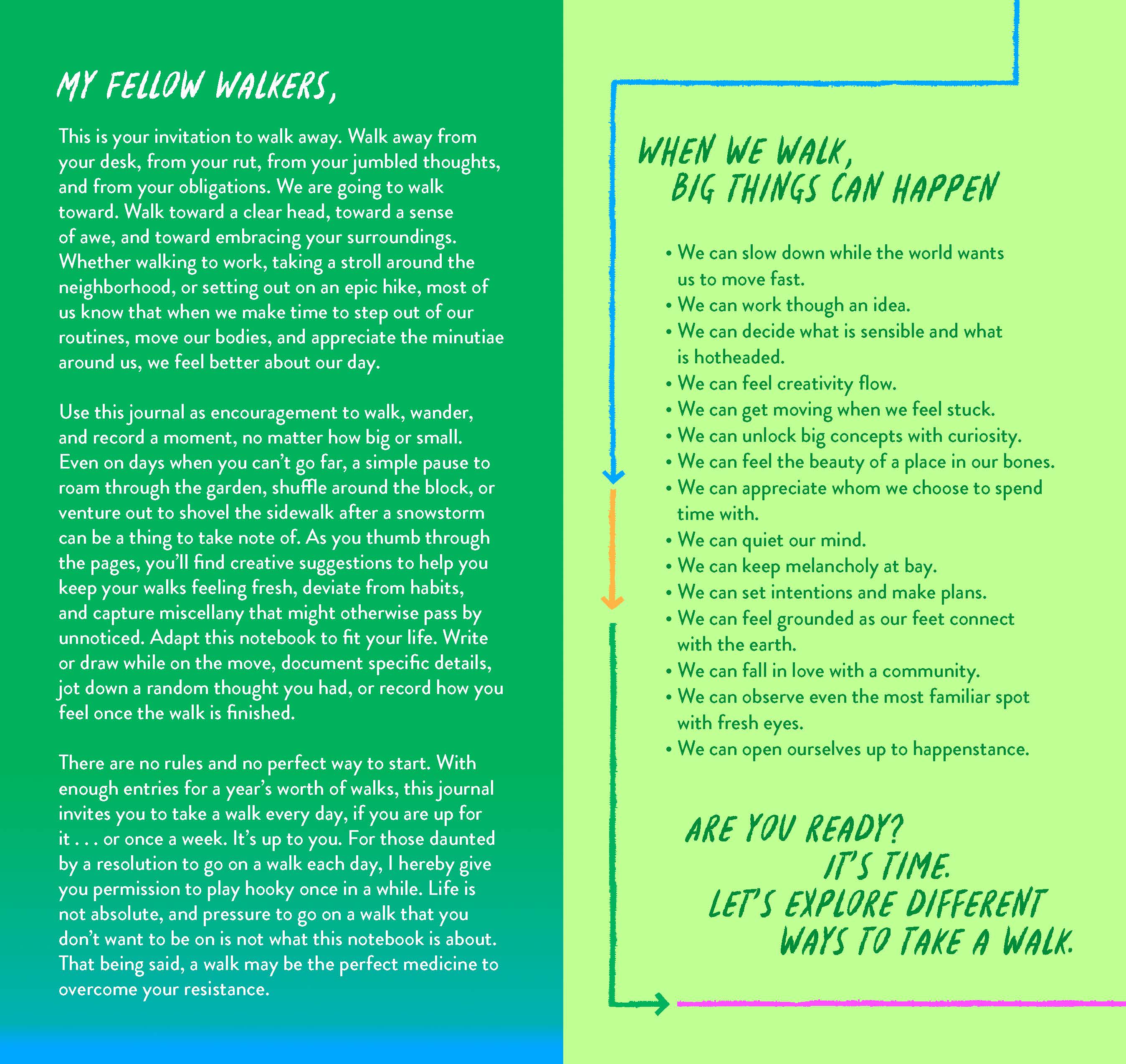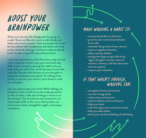 In celebration of the benefits and joys of walking, this illustrated journal includes 365+ undated daily entries so you can walk (and journal) at your own pace. Whether taking a brisk walk around the block, a leisurely stroll in the park, or exploring a new city, no walk is ever the same. Jot down notes about your route, or record thoughts and observations along the way or afterward. With an introduction full of creative prompts and inspiring suggestions, plus thoughtful quotes sprinkled throughout, this journal encourages you to record the moments along your journey—no matter how big or small.