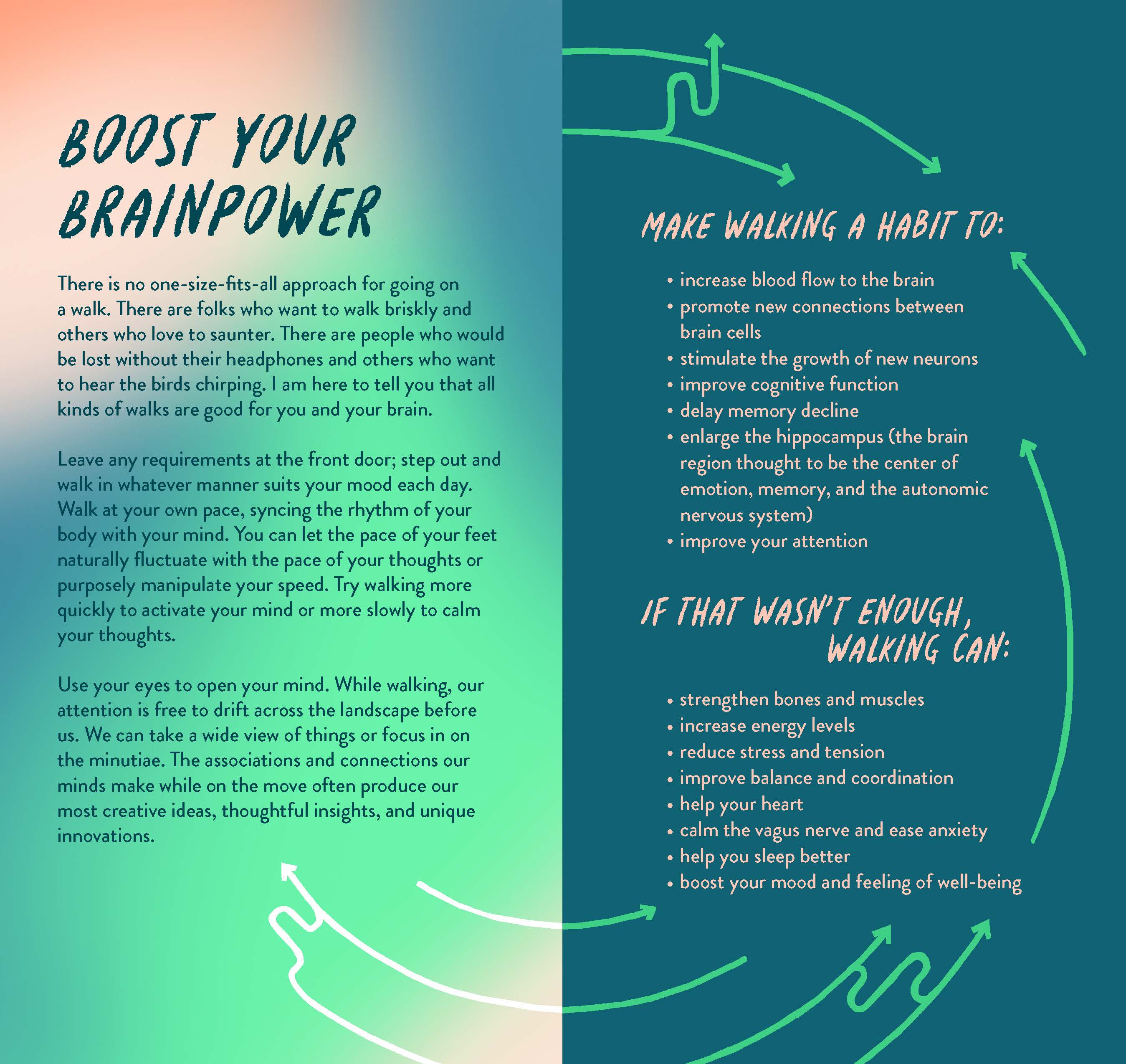 WALKING BENEFITS BODY AND MIND: Studies show that developing a walking habit is good for you. It helps your heart, improves circulation, strengthens bones and muscles, reduces stress and anxiety, boosts energy, and supports creativity and overall well-being.
