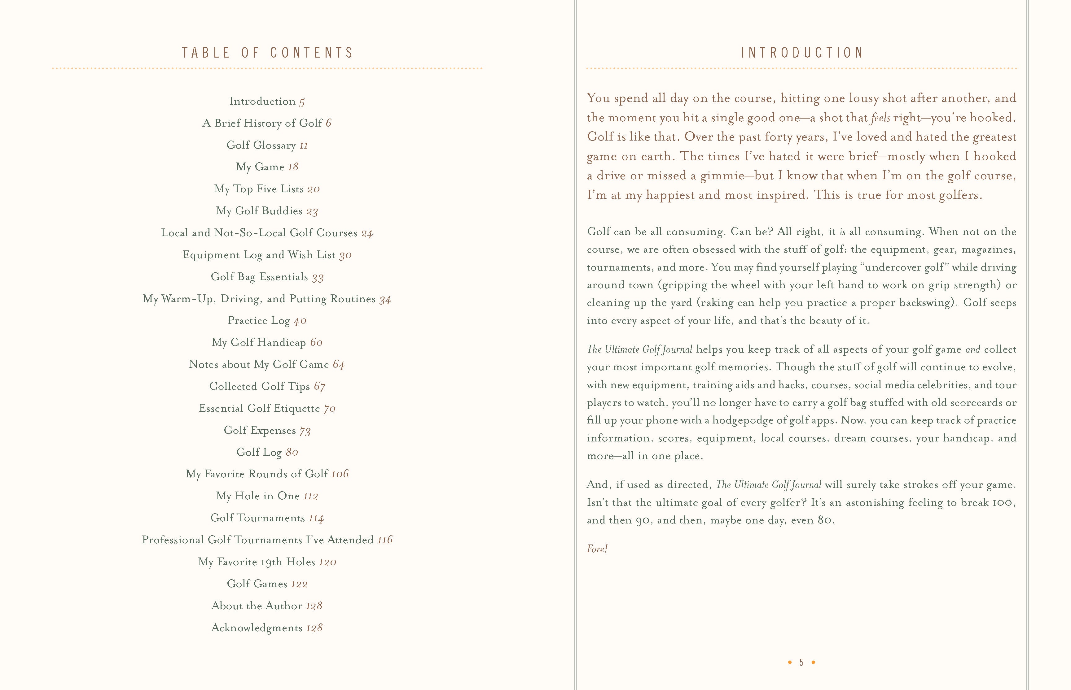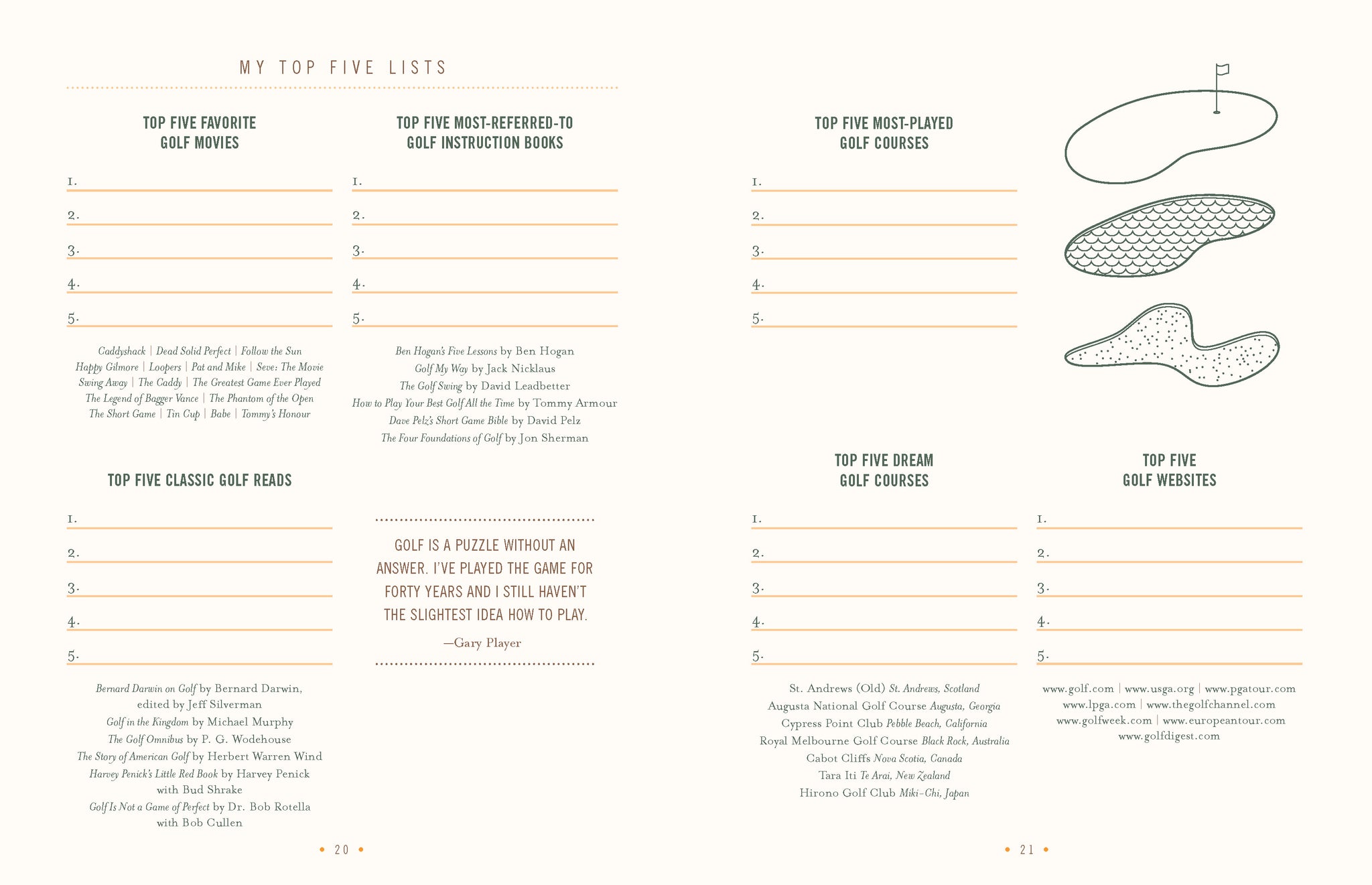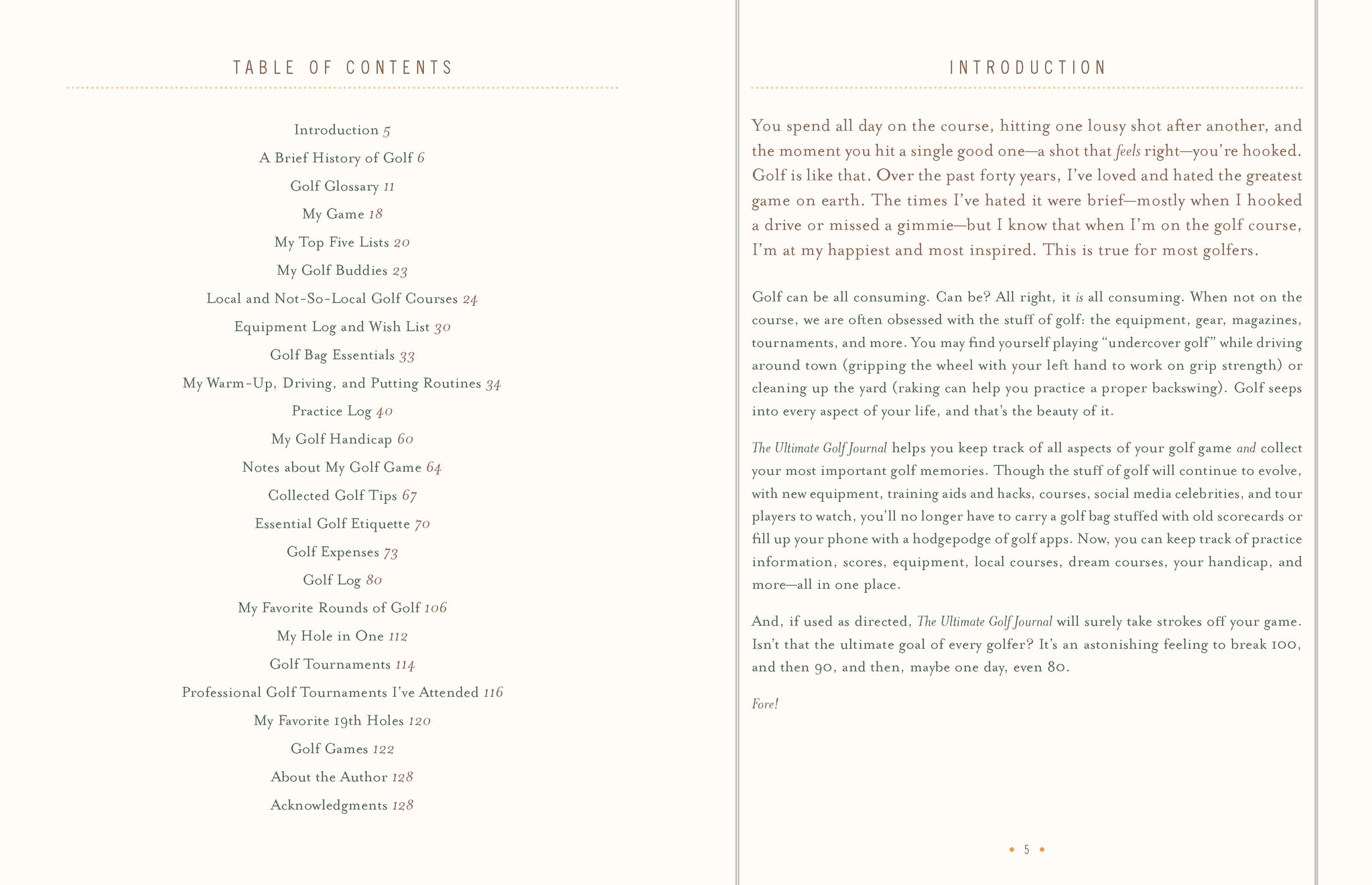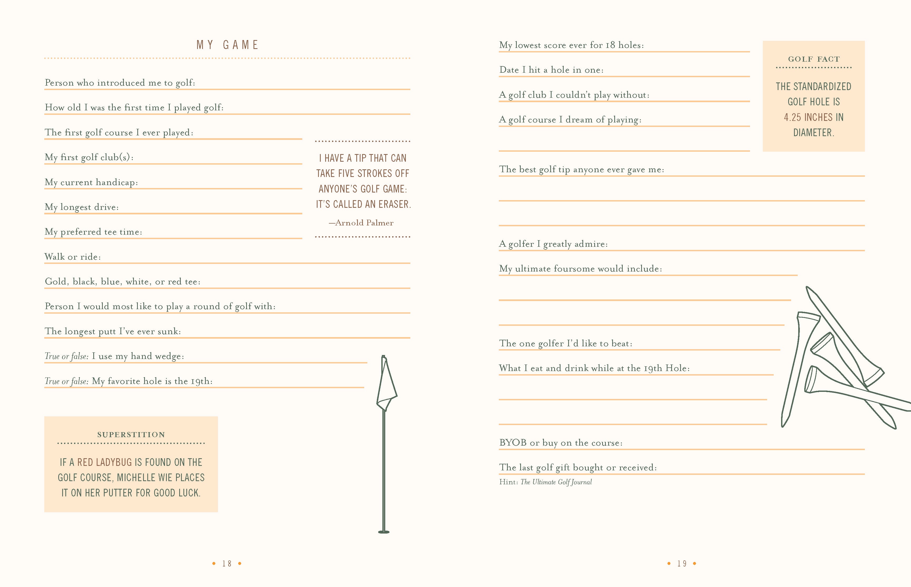 This classy journal contains all the tools and guidance a golf enthusiast of any level could ask for, from score sheets to practice range records and equipment logs, as well as sections to record local course information, golf advice, and your favorite 19th holes. Now, with everything you need to know in one place, you're sure to take strokes off your game in no time!