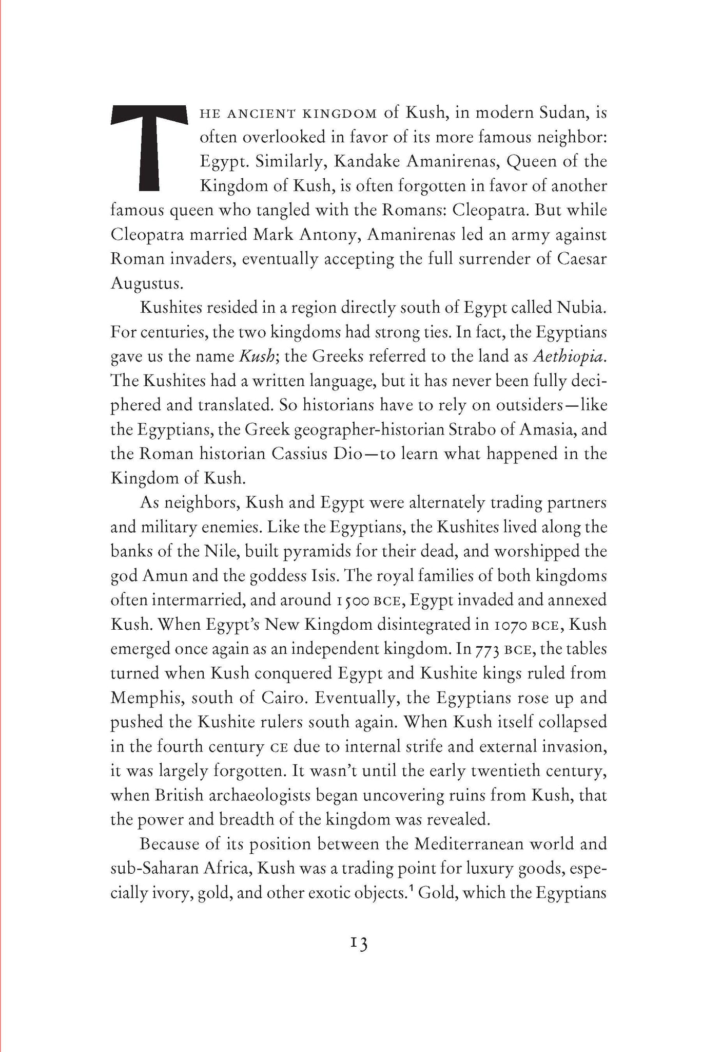- Kandake Amanirenas, queen of the Kingdom of Kush (modern-day Sudan), who led an army against the invading Romans