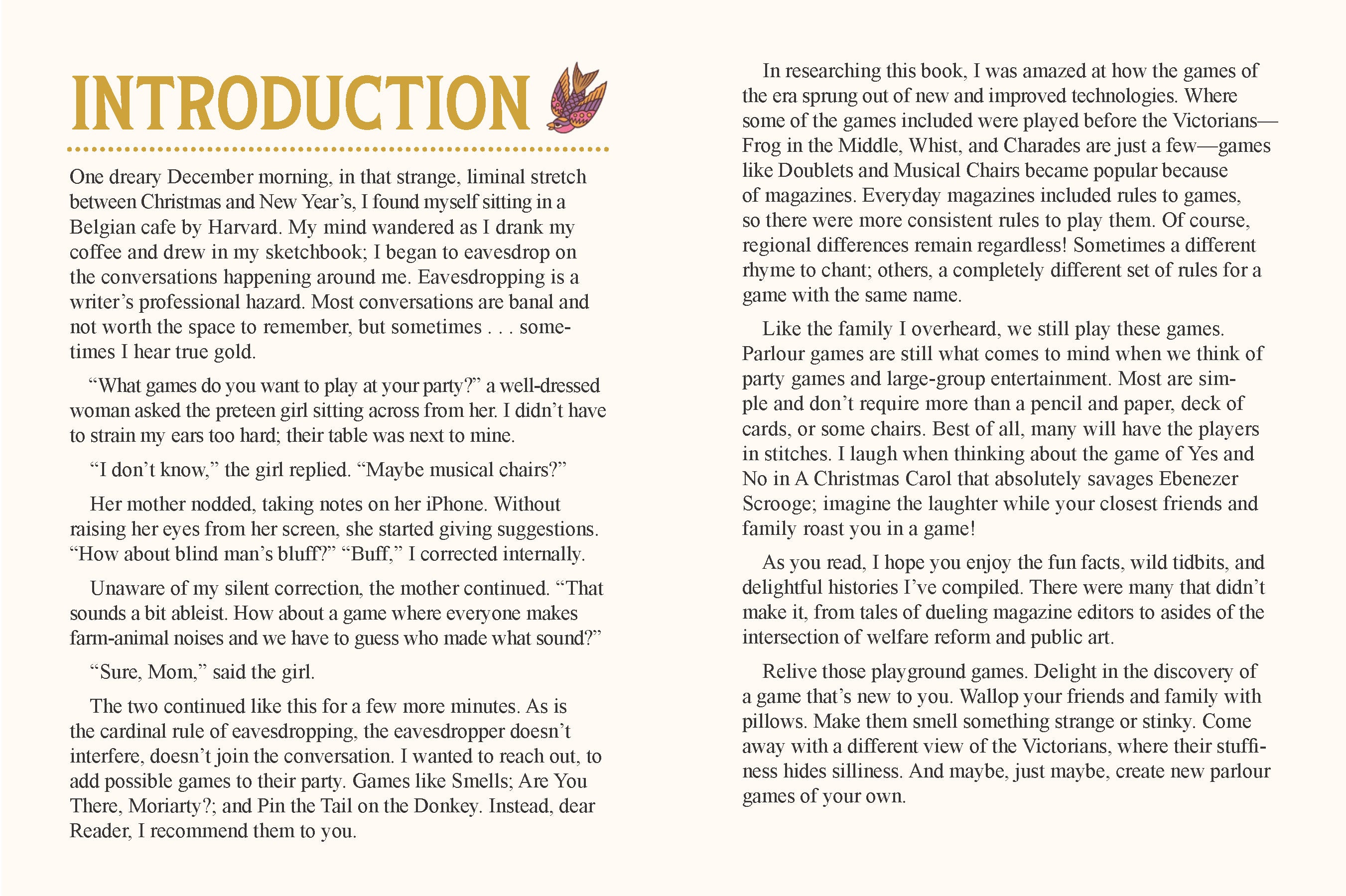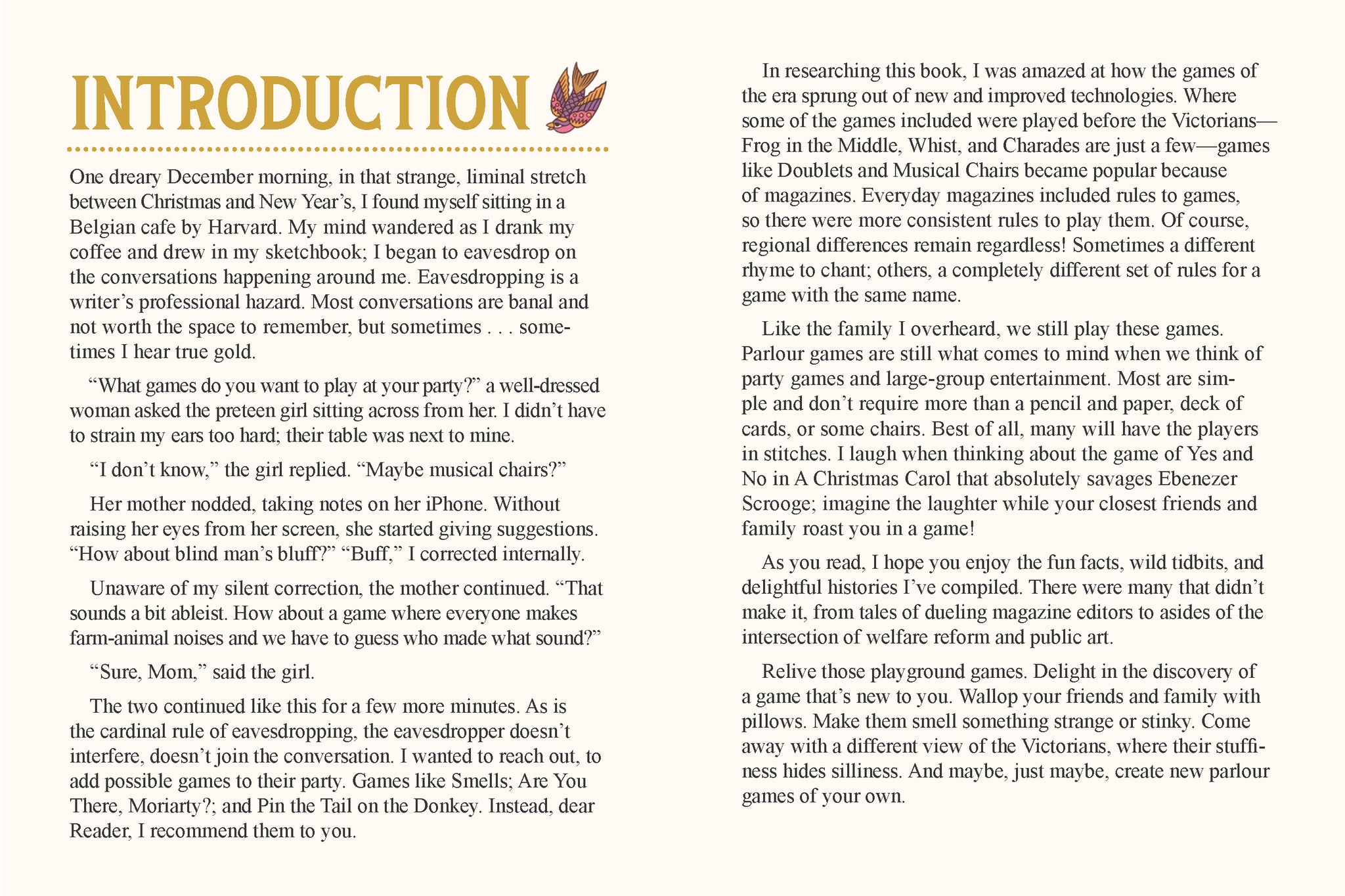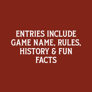 Each entry provides the original name of the game, any alternate names, the rules, and a brief history, complete with fun facts, notable connections (i.e., mentioned in a Charles Dickens novel, named after a Rudyard Kipling book, inspired by Sherlock Holmes, etc.), and what we call it today if the name has changed. Illustrations sprinkled throughout add to the fun and historical appeal of this unique game book, perfect for gifting or collecting.