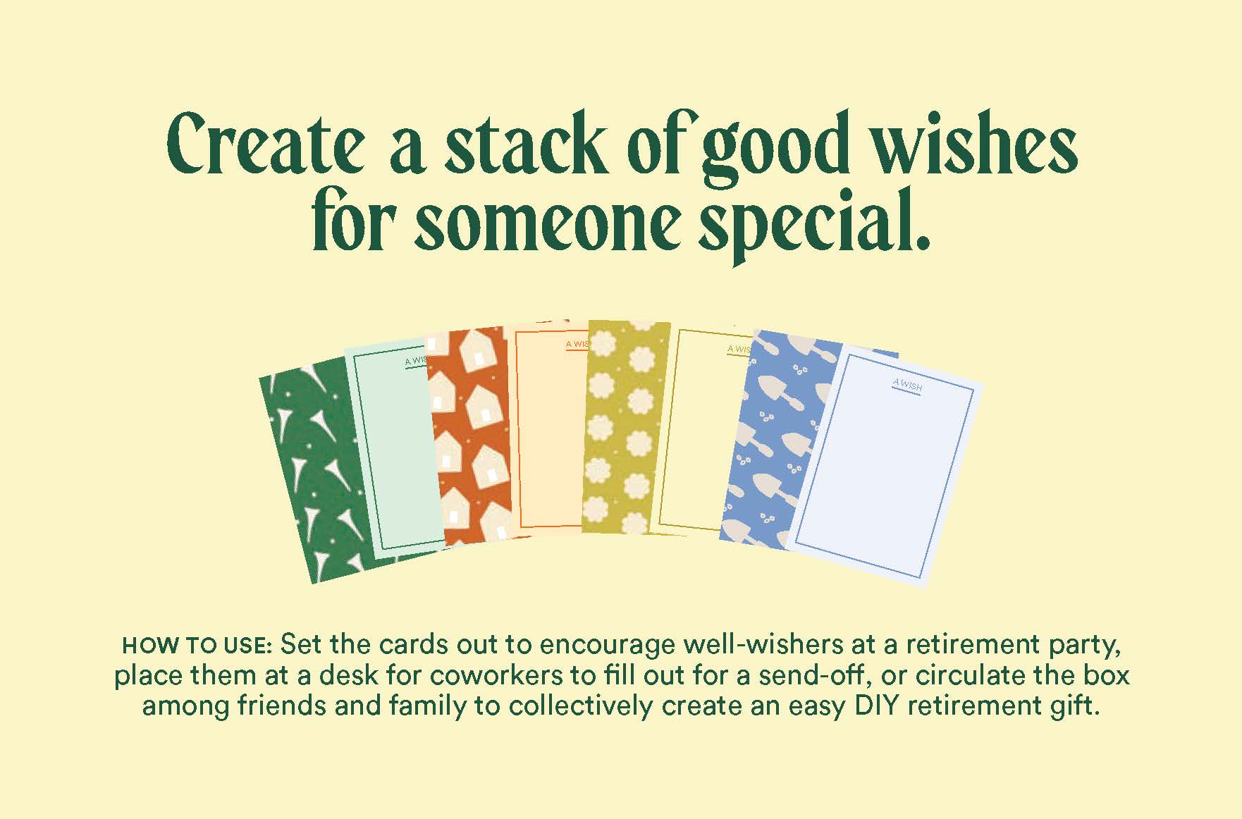 A welcome gift for anyone celebrating a lifetime of achievement, and a transition to the next step on their journey, these little cards make it simple and satisfying to create a stack of good wishes for someone special. EASY AND THOUGHTFUL GIFT: This charming mini card set is so easy to use—all you need to do is set it out on a table or display and voila: instant retirement gift-making activity!