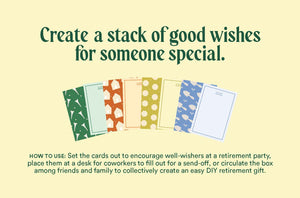 Set the cards out to encourage well-wishers at a retirement party, place it at a desk for coworkers to fill out as a send-off, or circulate it among friends and family to collectively create an easy DIY retirement gift. Inside are 50 charming mini cards that can be filled out and handed to the retiree, collected in a beautiful box or sweet mason jar, or framed to display at a retirement party for the honoree.